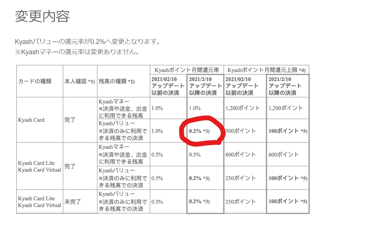 今回のkyashの改悪内容は、アイキャッチ画像にもある通り、kyashバリュー(クレジットカードチャージ)ポイント還元率が1.0%→0.2%に大幅に下がるというもの。