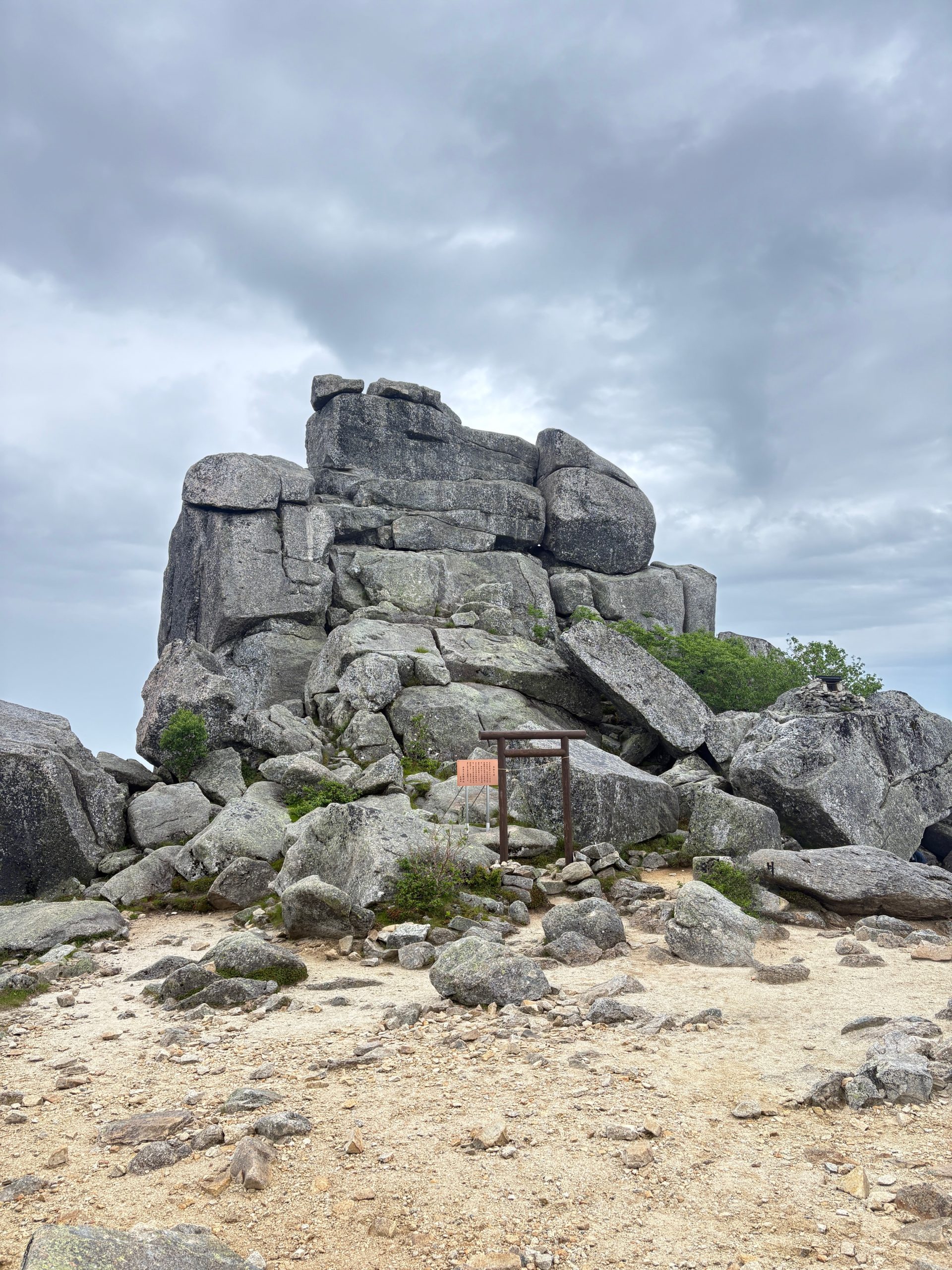 金峰山の山頂(2,599m)に到着する頃にもまだ小雨が降っていました。名物の五丈岩は小雨の中で神秘的な雰囲気。幻想的な雰囲気に包まれた静かな頂上を味わうことに。